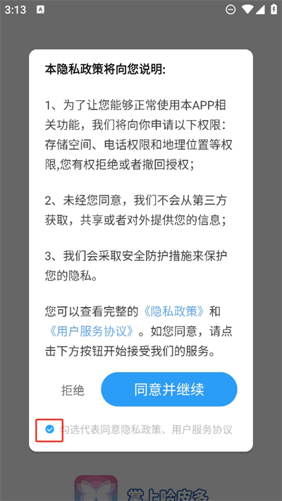 1、进入软件时需要开启一些相关的权限,才能正常的使用所有功能并且会保护你的隐私安全(勾选同意才能进入);