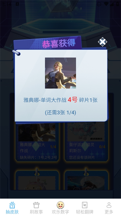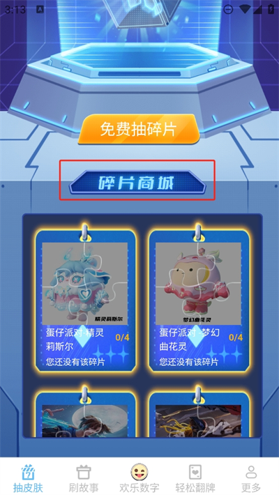 5、点击【免费抽碎片】后将会在商城中所有的皮肤中进行抽取,当每满四个碎片就能兑换皮肤啦。