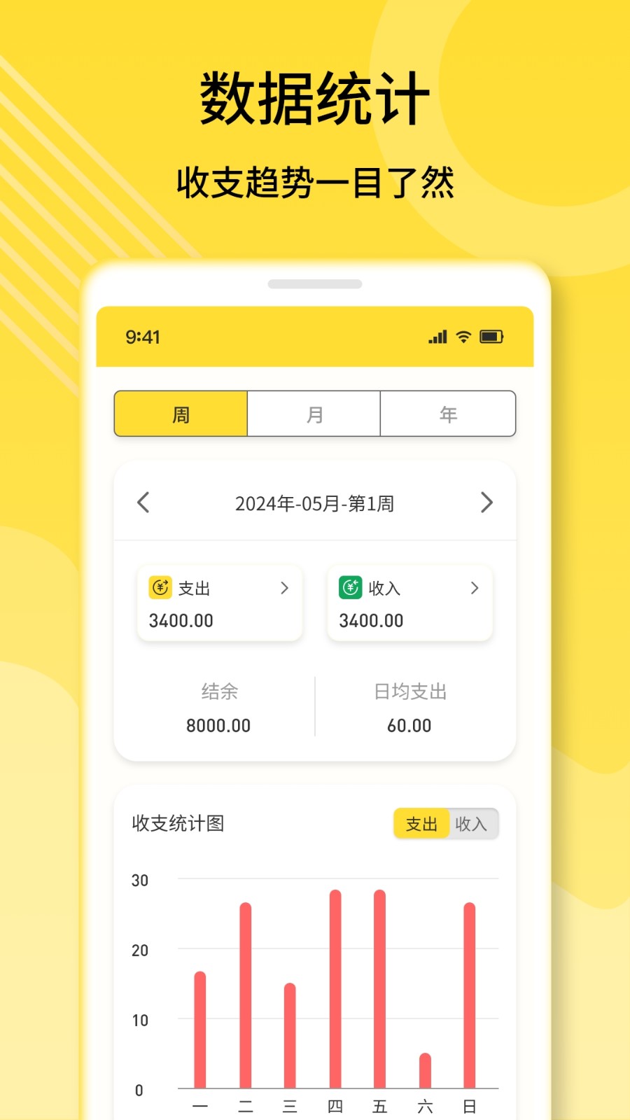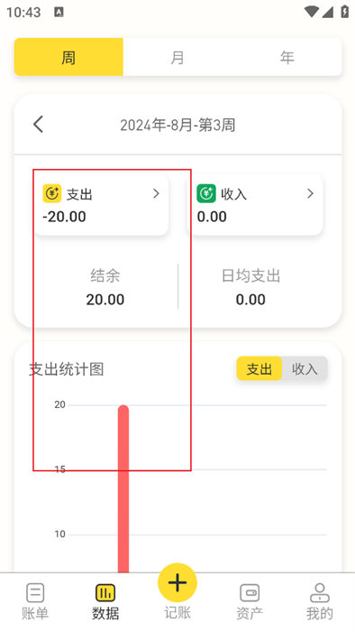 5、最后,大家返回首页,并切换到【数据】页面,可以清晰的看到消费的柱状统计图。
