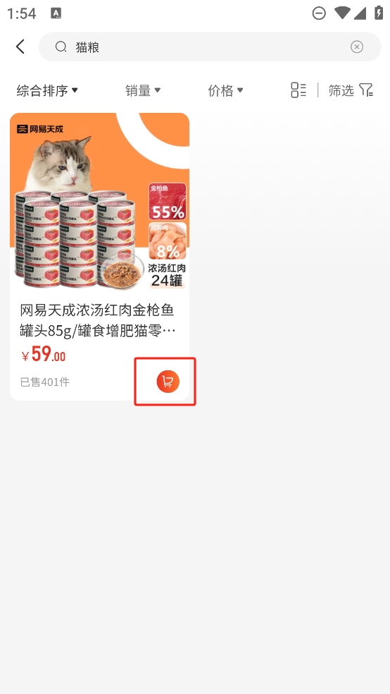 2、输入自己想要购买的商品,并进行搜索即可快速跳转平台有关猫粮的商品,点击右下角的购物车图标;