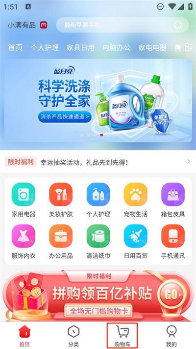 3、添加进入购物车后我们可以返回首页,看到下方的购物车类目中找寻添加的商品;