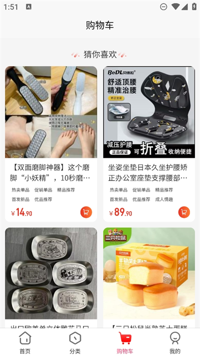 4、在购物车中就可以看到自己添加过的商品,同时还有根据历史浏览和收藏清单中进行推荐喜爱的商品。