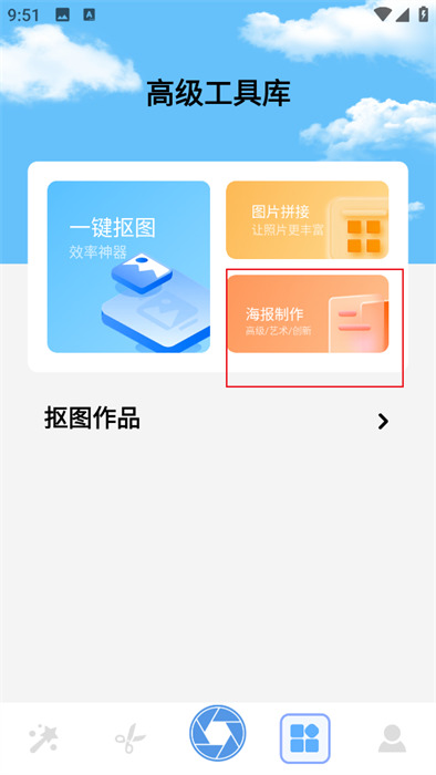 这里给用户准备了很多现成的拼接模版,如海报、抠图等等,这些都能通过不同的处理来打造完整的海报。