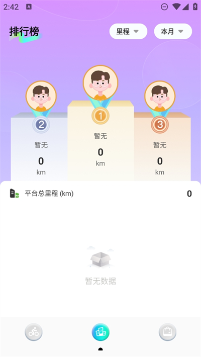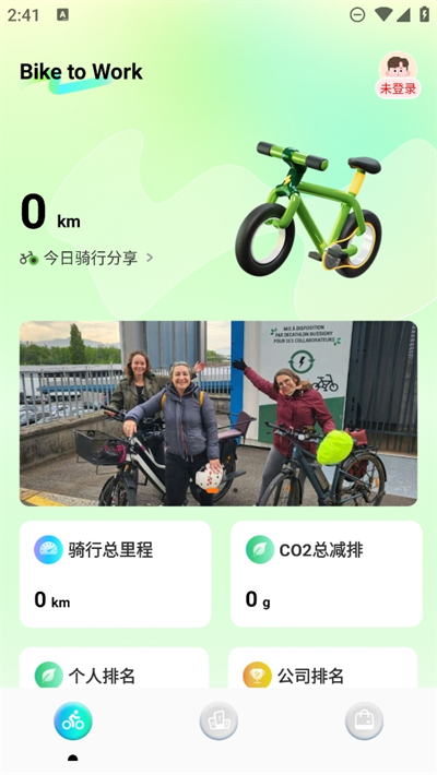 2、进入软件的主界面可以看到今日骑行的数量,也可以看到总里程和减排的数量信息等;