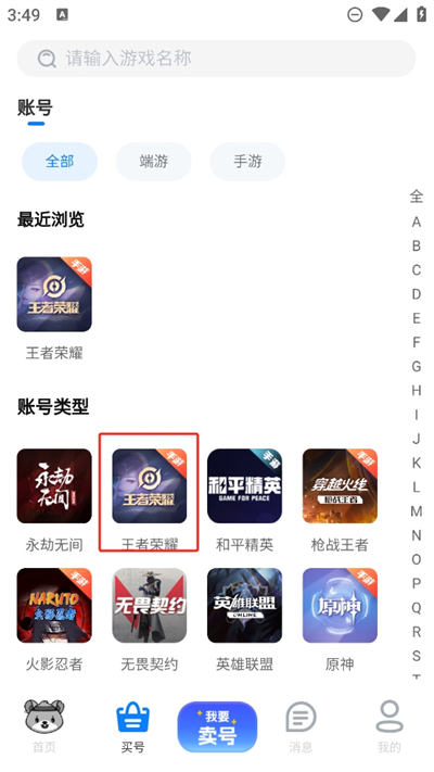 2、进入买号后可以看到有超多的游戏可以选择,不仅支持手游还有端游账号可以购买,以王者荣耀为例;