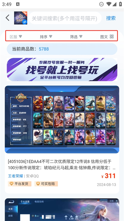 3、进入后可以会根据游戏内容进行条件筛选,比如区服、排序、筛选、图文等条件筛选;