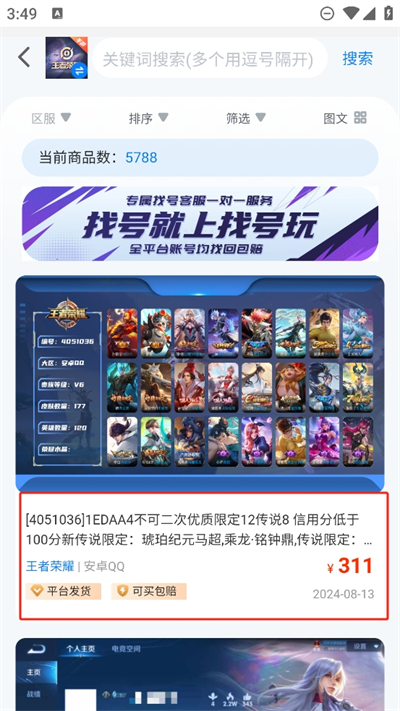 找号玩专为账号交易提供的软件,对于如今的账号交易上提供更加专业的线上交易安全保护服务,拥有最强大的专业团队保驾护航,为玩家们提供了超多热门游戏的账号交易和担保服务,帮助各位能够实现更加专业的线上交易服务,同时还能够为各位在对于账号的交易上更加的安全丙炔和更加放心,所以在此可以帮助你们在对于账号的选择上有了更安全的地方进行交易,一起来看看吧。
