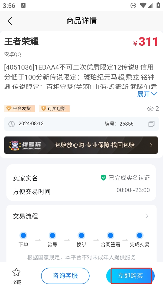 5、进入后可以看游戏账号的相关内容信息,并拥有详细的交易流程查看,通过点击立即购买即可下单。