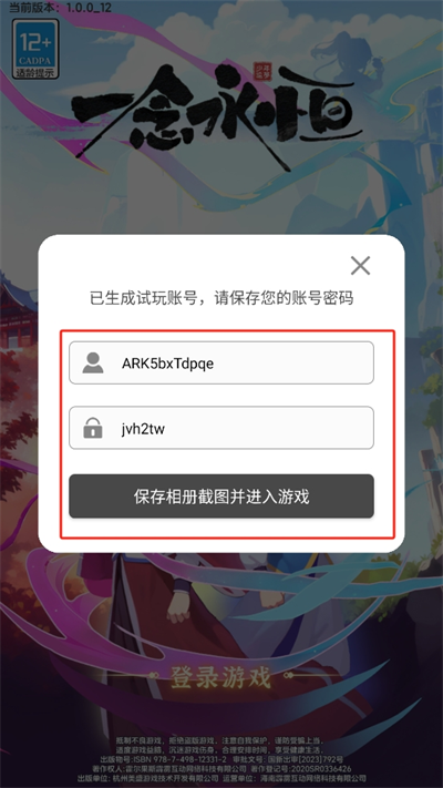 2、进入游戏后由于是预下载玩法,所以会自动生成试玩账号,通过保存相册截图并进入游戏;
