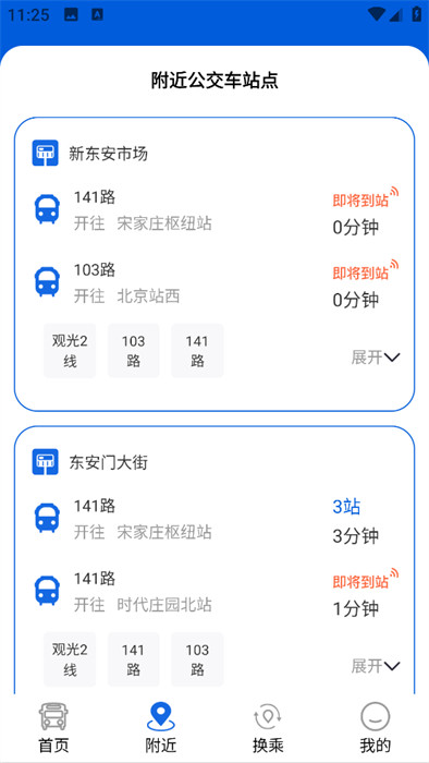 3、随后,切换到【附近】板块,这里能给你展示最近的一些车辆信息,找到需要去的车站;