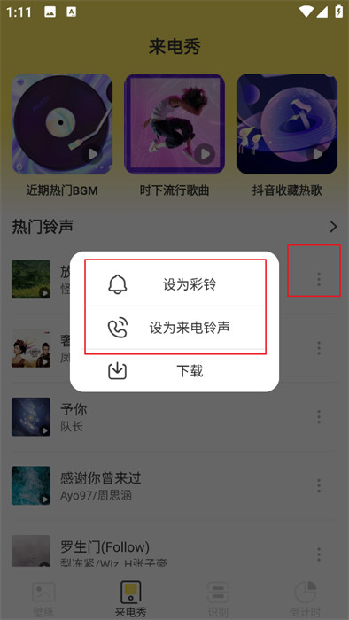 4、最后,点击后面的三点按钮,能够设置成来电铃声或者下载到相册,操作起来非常的便利。