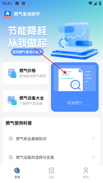 2、随后,你进入到首页,点击【查询燃气】按钮,这样能更高效的进行操作;