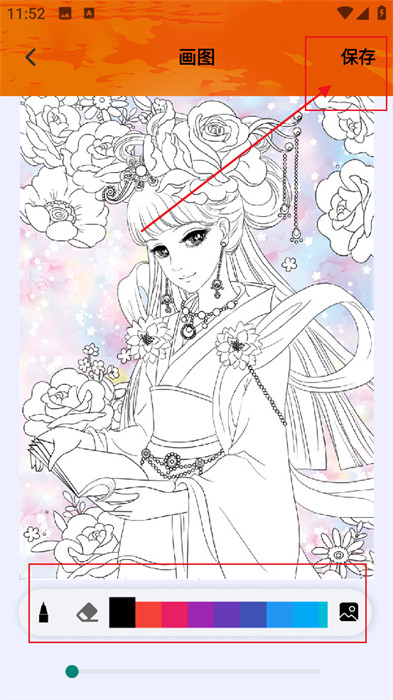 5、最后,你就可以挑选喜欢的颜色进行涂色,并点击右上角的【保存】,这样一幅画就创作完成啦。