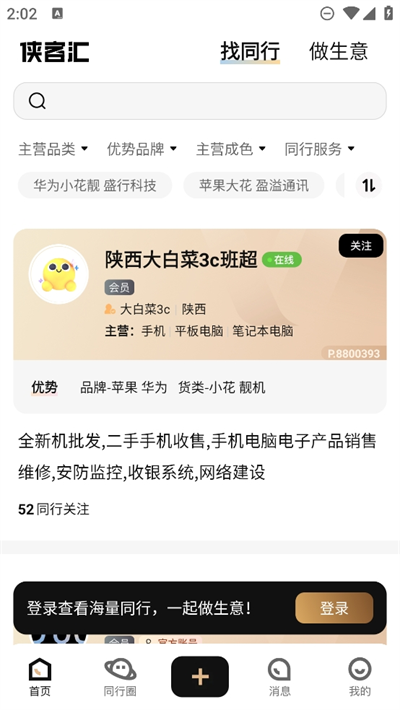 侠客汇平台是一款能够让二手生意市场专为线上交易的软件,你们将在这里体验到二手生意下的一站式服务功能,为了能够让生意更好的发展下去,平台更是为同行们提供更加高效化的信息匹配服务功能,为大家在平时对于二手市场的贸易上快速的找到靠谱的同行,并进行高效的信息匹配服务支持,为大家带来更简单轻松的货源管理服务,享受一站式安全认证的二手社交贸易服务平台。