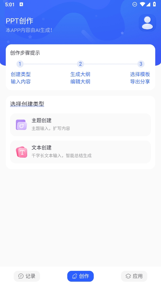 2、在这里可以创建不同类型的内容进行生成,支持主题创建和文本创建两种模式选择;