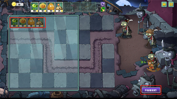 1、进入到场景内之后,玩家将需要进行植物的选择,进行点击即可,点击好之后,进行右下角按钮的点击;