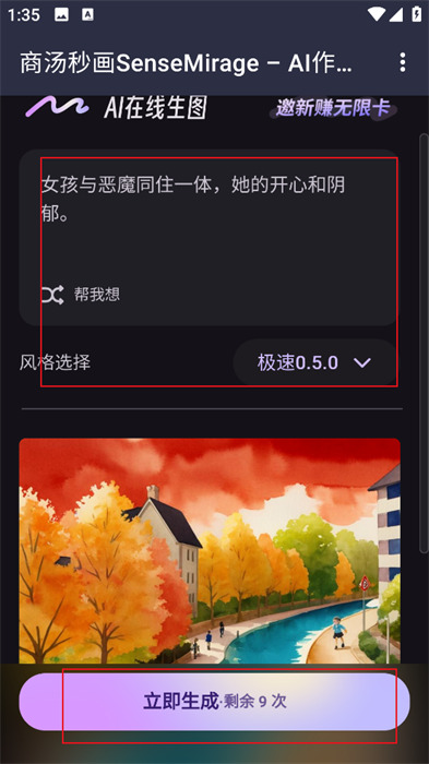 4、最后,大家可以看到这里已经自动生成了描述和创作风格,点击【立即生成】就能看到高清的图片。