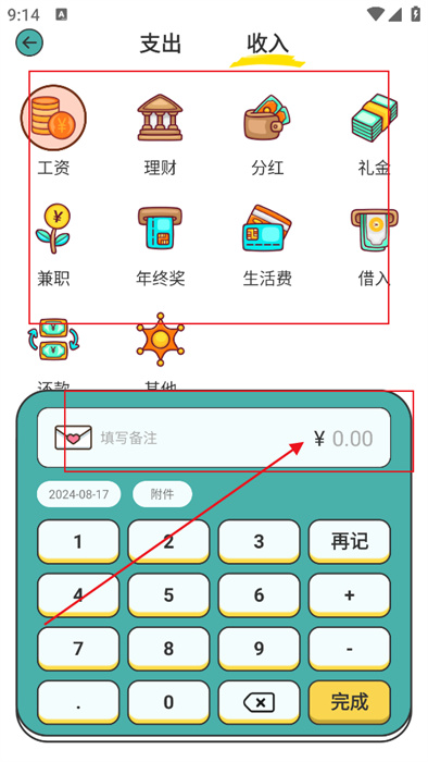 5、在选择之后,能看到这里有很多不同的分类,并在下方键盘处输入金额,并点击【完成】;
