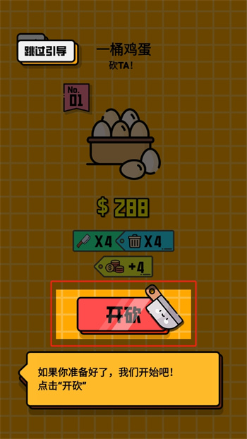 3、继续跟随着新手指引,点击【开砍】进入到砍价的游戏任务中进行挑战;