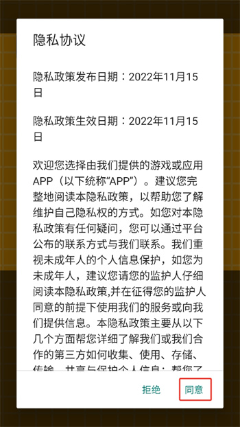 1、点击游戏进入其中,首先会看到一个隐私协议,点击【同意】按键进入游戏;