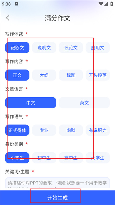 4、最后,只需要将标记了红星的部分填写清晰,越详细越好,最后点击【立即生成】,就能等待作文的生成啦。