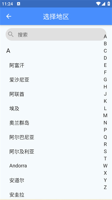 4、选择所在的区域,利用开头的字母能够迅速的找到自己所在的区域。