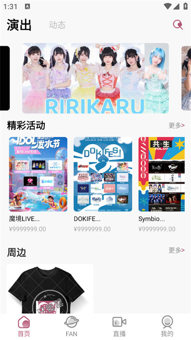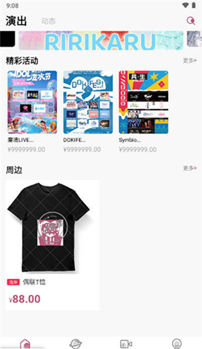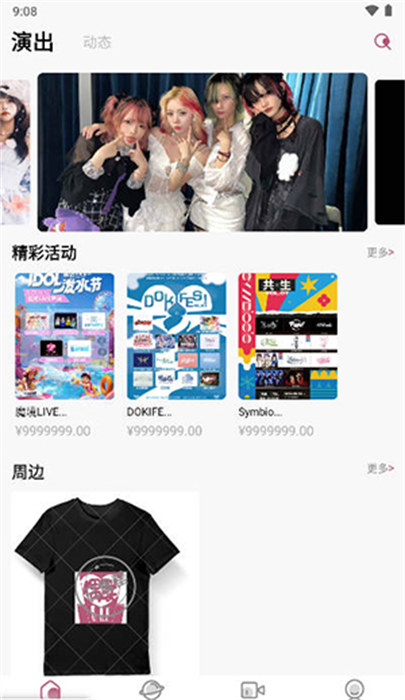 2、在首页里面可以查看到演出和动态信息的内容,还能看到周边商品资源内容;