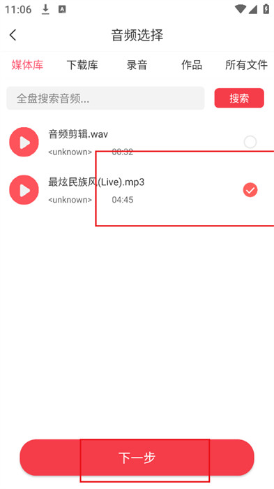 3、接着,在设备中挑选现成的音乐,并点击【下一步】;
