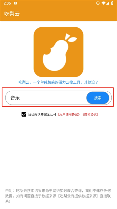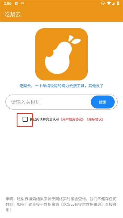 1、进入软件后为了能够正常的搜索,需要阅读并完全认可《用户使用协议》《隐私协议》并进行打勾;