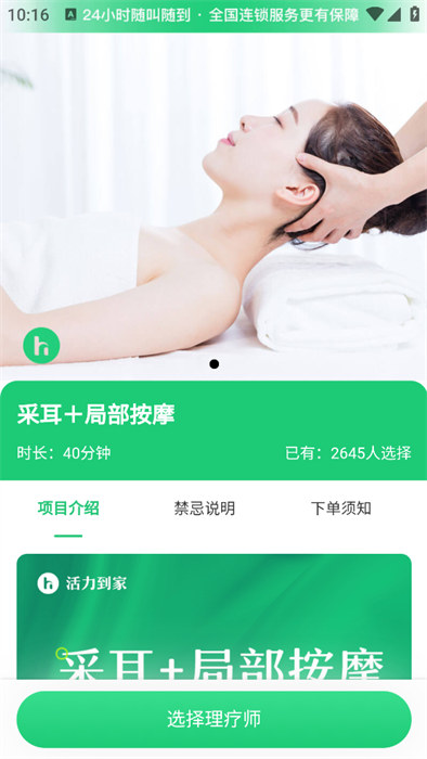 2、点击自己想要上门的服务内容就能查看到项目内容的详细信息和禁忌说明等;