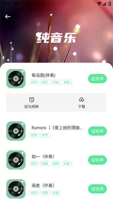 1、可以看到各种各样的纯音乐的铃声资源;