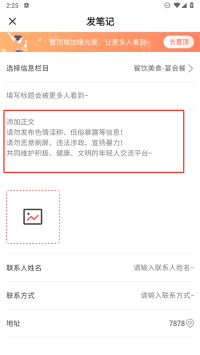 2、在这里就可以进行内容的信息发布,值得注意的是在发布的内容中要避免这些问题,提倡文明交流;