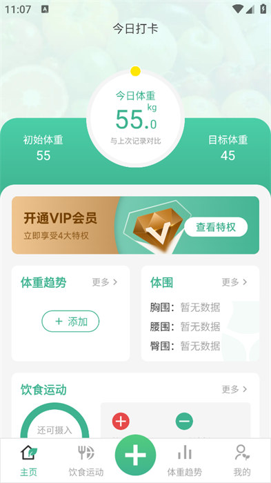 2、在软件的主页可以看到自己的目标体重和目前的体重信息;