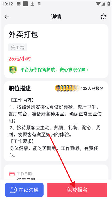 5、如果你觉得当前岗位看起来比较满意,完全能点击最下方【立即报名】,这样沟通起来会更便利。