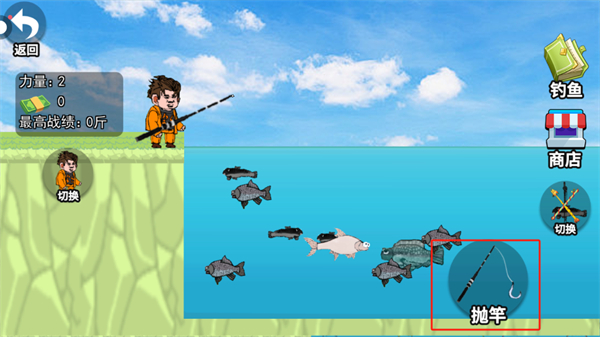 2、此时玩家将会进入到一个二维的平面钓鱼场景内,可以点击朋友右下角的【抛竿】按钮,以进行鱼竿的抛掷;