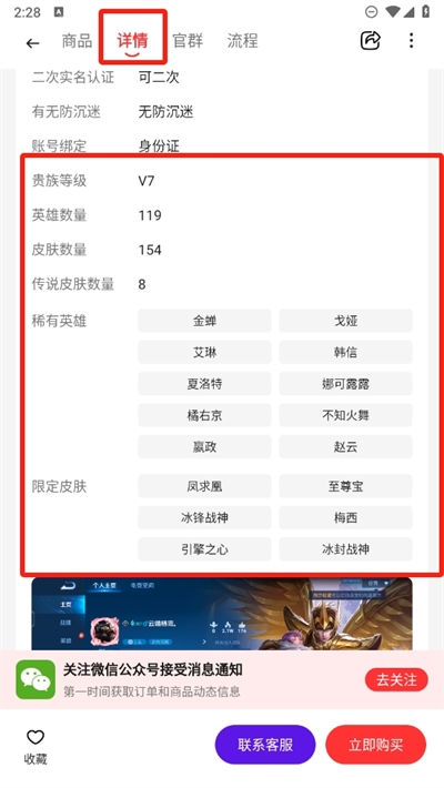 4、进入后可以在商品详情页面中看到所有有关账号的内容,比如账号登录、皮肤和英雄的数量等等;