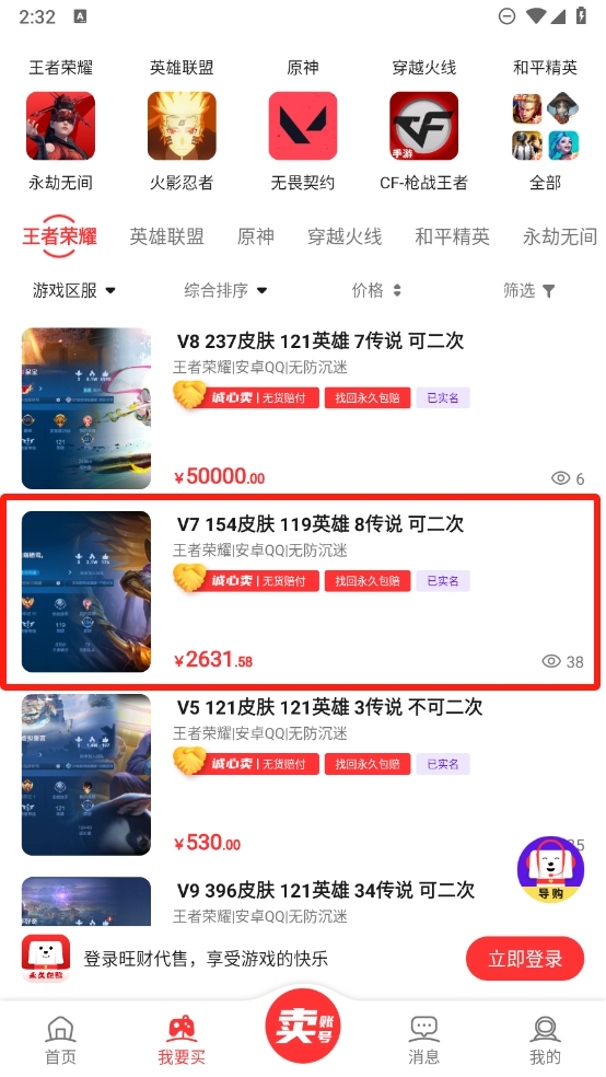 3、我们随机在王者荣耀这个游戏中找寻售卖的账号吧,选择这个可以看到账号交易的价格等信息;