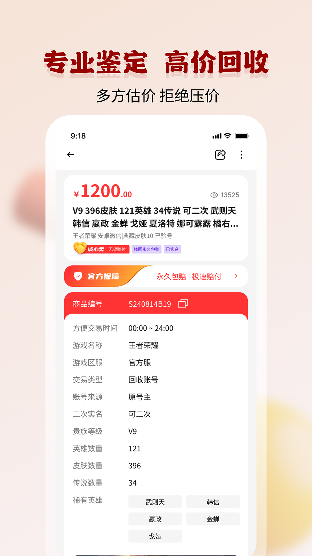 线上直接进行账号的预估评测快速报价,实现快速成交并及时到账;