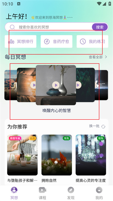 2、随后,进入到首页,可以看到有超多的冥想课程和音乐,你可以随意挑选;
