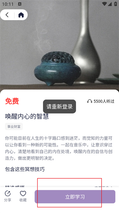 4、如果你遇到了感兴趣的冥想课程,可以点击并进入,点击下方【开始学习】,如下图;