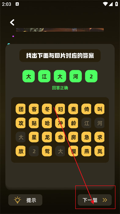 4、在答对之后,可以向下滑动,点击【下一题】,如下图所示;