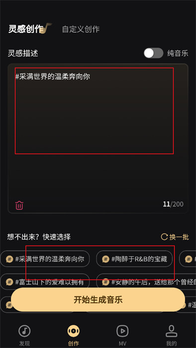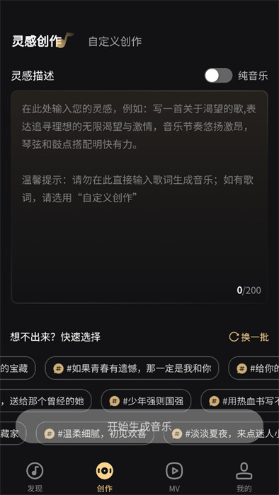 3、接着,你可以点击下方的话题,并在上方输入框内对音频有具体的解释,并点击【立即生成】;