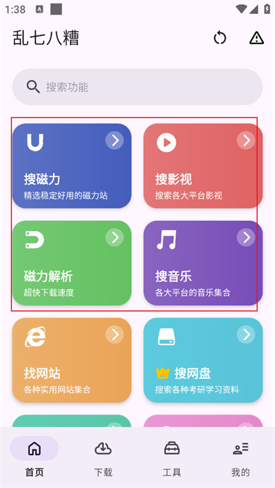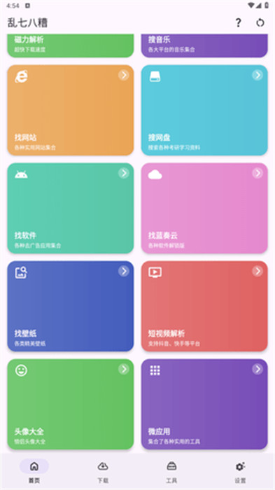 乱七八糟app是一款非常好用的工具箱平台,这里不论是常见的一些办公软件还是音乐资源,都能在线查找,并且在获取到设备的权限之后,任何时间都能点击操作,十分的便利,还可以满足很多小伙伴的使用需求,同时这里会将类似的工具进行整理,一定能带来更加完整的资源,新手也能顺利使用,不仅如此,这里还能将喜欢的资源缓存下来,方便在空闲时间也浏览,如果你觉得当前工具非常好用,快分享给好朋友,叫上大家一起来这里体验!