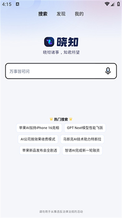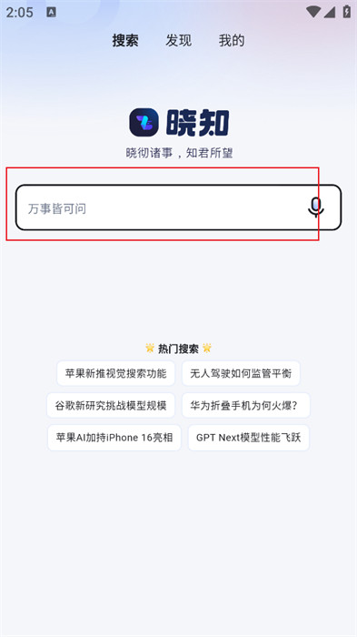 晓知app是一款专门通过大模型创建的ai搜索软件,这里能不断的同步目前社会上的一些新闻和实践,让大家都能在这里对社会更加了解,如果遇到任何板块有趣味常识,都能直接订阅,这样才能第一时间通知到大家,同时还可以在线搜索,简单的通过关键词对类似的知识进行掌握,不仅如此,这里还会结合你长时间的喜好来推荐一些类似的行业知识,以便也增加日常的工作效率,减轻一些压力,如果你也想要常识这样优质的工具,快来小编这里下载吧!