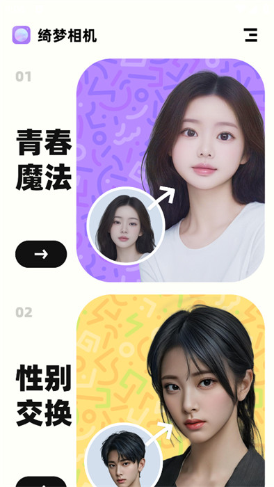 绮梦相机app是一款非常优质的照片修改工具,软件内的各种功能都能进行整理,如重返青春、性别交换等等,在获取了设备的相册权限之后能够直接转换,十分的便利,可以直观的看到自己照片上的变化,并且整个工具完全免费,大家无需额外进行付费体验,不仅如此,这里的功能也会长期保持更新的状态,这样才能让每次的变化短时间内看到效果,如果你也对于日常的编辑十分的感兴趣,快来小编这里下载体验吧!