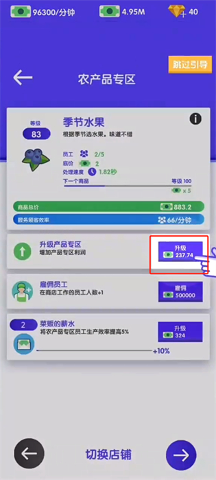 3、点击屏幕之中紫色箭头的指示位置,以进行各种农产品的升级,并对摊位进行升级;