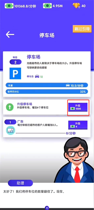 5、移动你的角色回到停车场的位置,点击该位置的加号按钮,以进行停车场的修建以及升级;