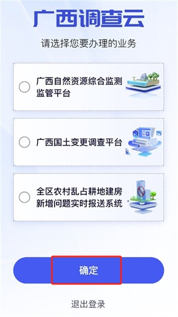 2、随即在这里点击你想要办理的业务,然后继续点击下方的【确认】即可进入其中完成自己的田地调查任务;