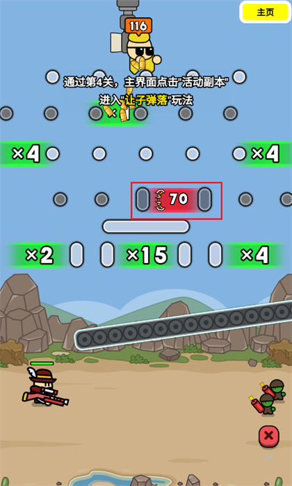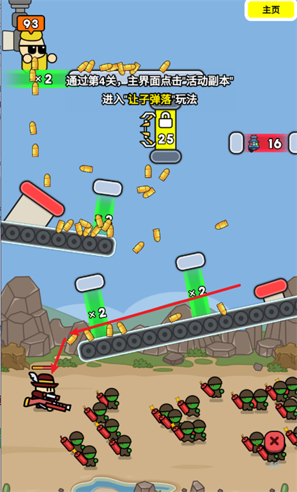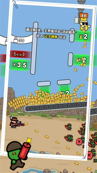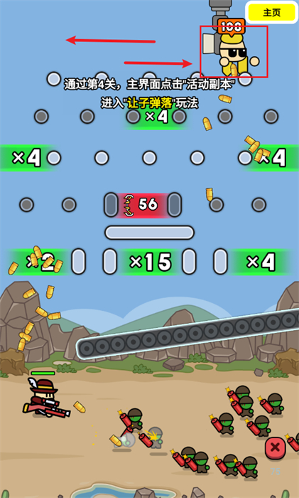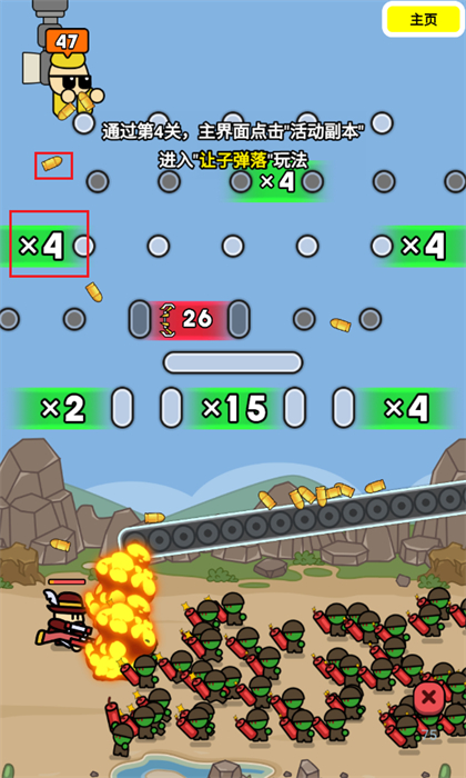 2、此时玩家将会进入到战斗场景之中,需要不断的滑动屏幕上方的子弹派送小人,以确保小人能够将子弹投射出去;