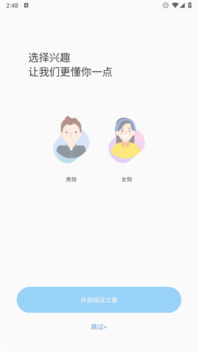 1、进入该软件后将会根据不同的喜好选择,让推荐页可以智能推荐有关小说作品;